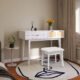 43.3″ Beige Farmhouse Makeup Vanity – LED Mirror, Storage Stool & Charging Port