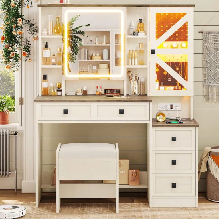 Rustic Farmhouse Makeup Vanity Set – Vintage White Table with Stool