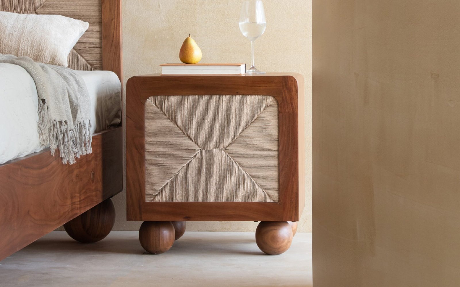 The Abacus Queen Size Bed and Bedside Table share a warm, unified Kiara finish on Acacia Wood. Sculptural, rounded feet give both pieces a playful yet grounded silhouette. Danish Cord weaving forms the striking headboard and the table accent, lending a beautiful, natural texture to the geometric forms. This combination of robust wood and woven detail brings a quiet, organic elegance to the modern bedroom.