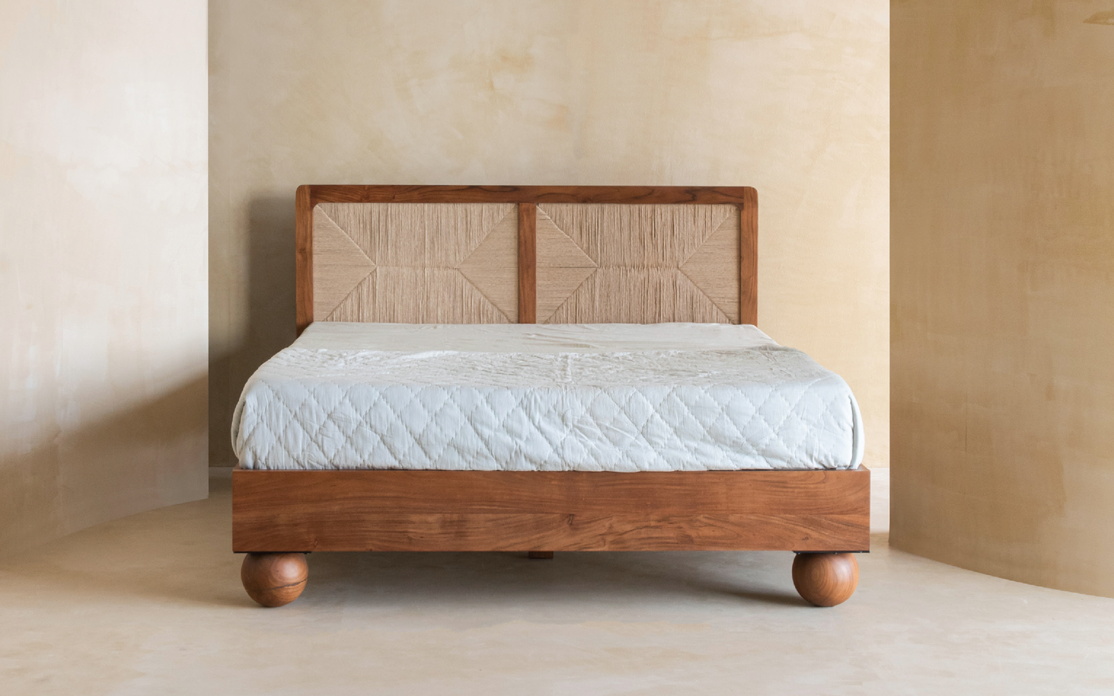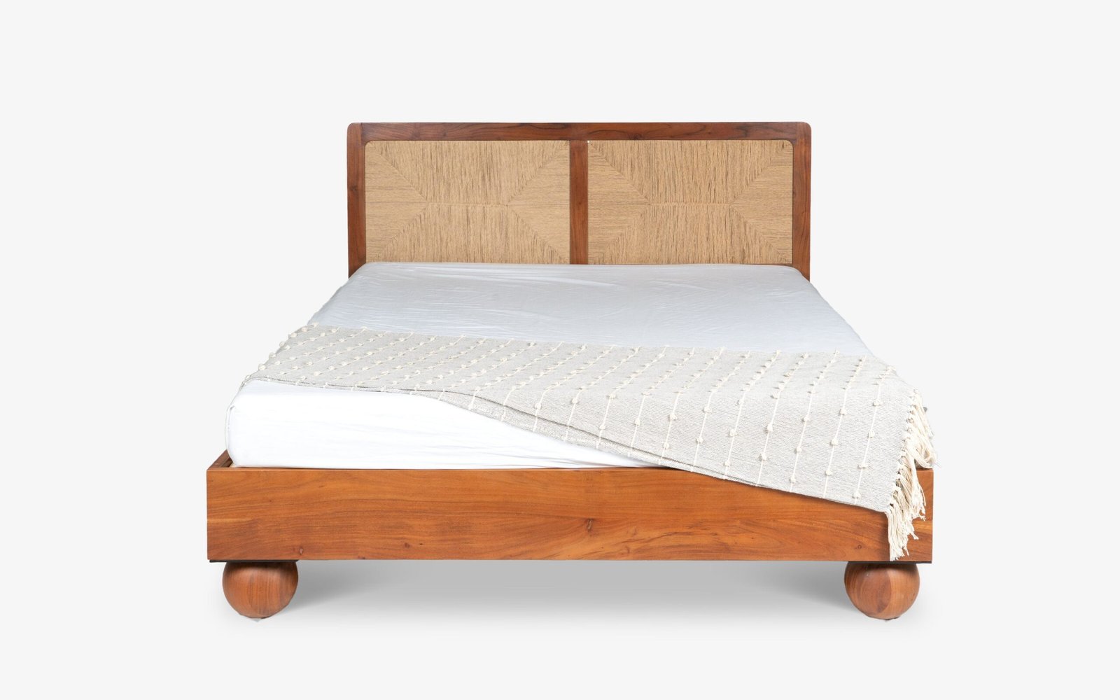 Elevate your bedroom with the Abacus Bed, inspired by the timeless form of the Abacus tool. This wooden queen-size bed features deep dimensions and expansive comfort. The Danish cord-hand weaving headboard adds natural ornamentation, while the sturdy solid wood frame is supported by spherical legs for a unique aesthetic. Balancing rustic charm and modern minimalism, is an elegant blend of relaxation and refinement, making it a perfect centerpiece for your bedroom.