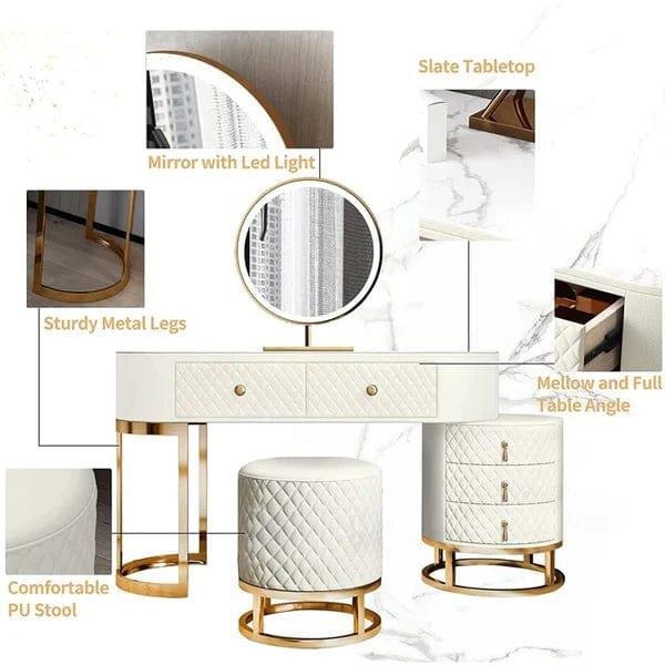 Transform your morning routine with this practical and stylish vanity table. Designed to simplify your beauty regimen, this vanity allows you to easily access your makeup and skincare products, ensuring every morning starts smoothly. The countertop features a stunning slate tabletop with a unique texture, complemented by solid wood drawers made from E1-graded MDF, which are free from odor and radiation. With a sleek white and gold finish, this vanity is as stylish as it is functional.