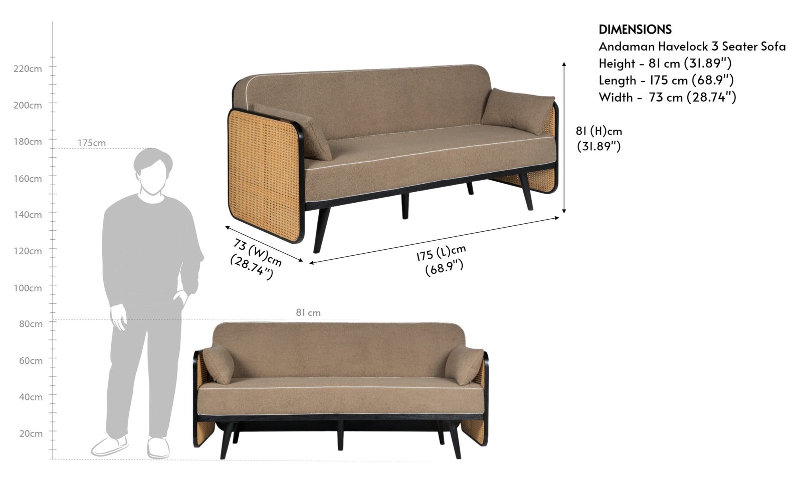 Radiate sophistication with the pinnacle of style in the Andaman Cane Sofa 3 Seater. Meticulously crafted from enduring acacia wood, it features a sleek black air brush finish for timeless longevity and is complemented by natural rattan cane. This three-seater stunner has legs slanted slightly outward for stability, assuring longevity while also adding a contemporary flair.
