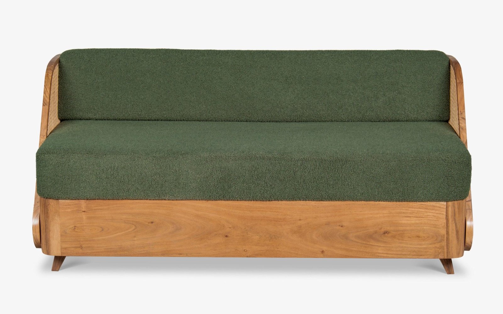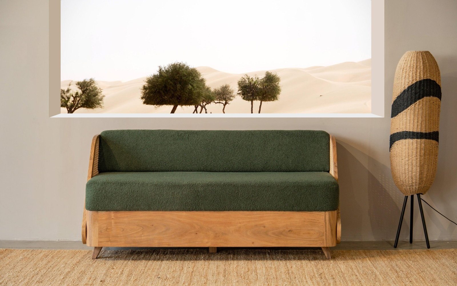 Discover the Andaman 3-Seater Sofa, which is unrivaled in sophistication. The lush green upholstery blends nicely with the robust legs and diagonal hand rest, resulting in a wonderful mix of design and craftsmanship. Elevate your living space with this excellent blend of natural materials and sophisticated design.  Immerse yourself in luxury. The Andaman Sofa is more than simply a piece of furniture; it is a statement of refined taste and artistic brilliance.