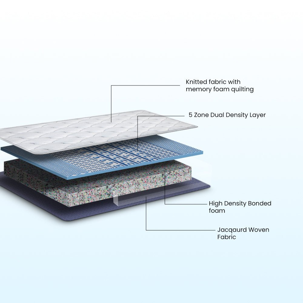 Research-backed and designed to perfection, Balance is all about a rejuvenating sleep experience accompanied by enhanced 5 zoned body support. Ideal for everyday use, this orthopedic mattress aligns the spine and supports the back. The memory foam layer on top provides pressure relief and substantially boosts the quality of your sleep.