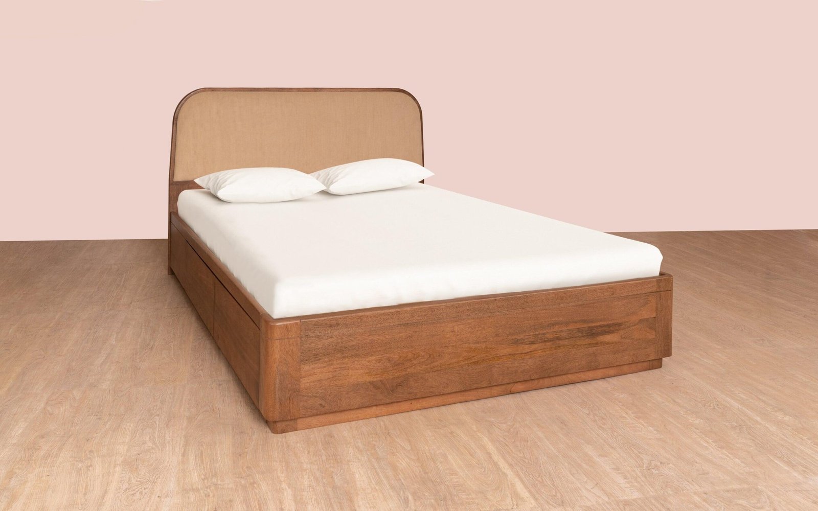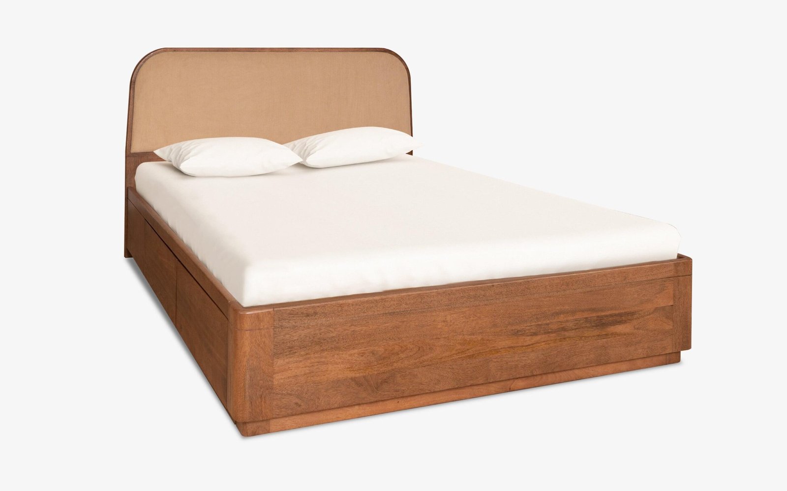 The Buda Bed blends refined simplicity with functionality, offering soft curves in durable corduroy with various color options. This bedroom double bed with storage, available in King and Queen sizes, includes a drawer storage system. Perfect as a modern bed, it embodies timeless design and durability.