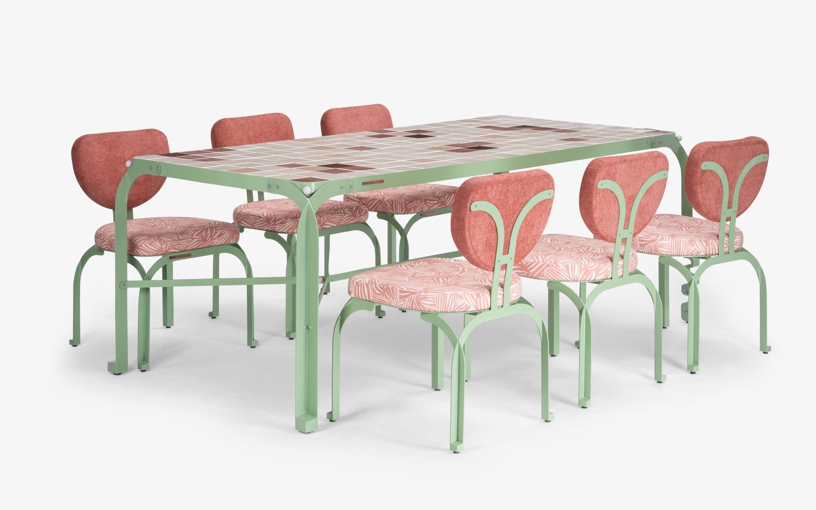 Experience outdoor dining redefined with the Dastoori Outdoor Dining Table and 6 Chairs. Designed for modern alfresco living, the set features a sleek, minimalist stainless steel table frame topped with a beautifully hand-laid custom tile surface. Six ergonomically designed dining chairs offer exceptional comfort with structured silhouettes and signature springing backrests, balancing style and relaxation. Detailed with cast aluminum accents, this ensemble showcases fine craftsmanship and delivers a warm, contemporary dining experience that embodies the spirit of the Dastoori collection.