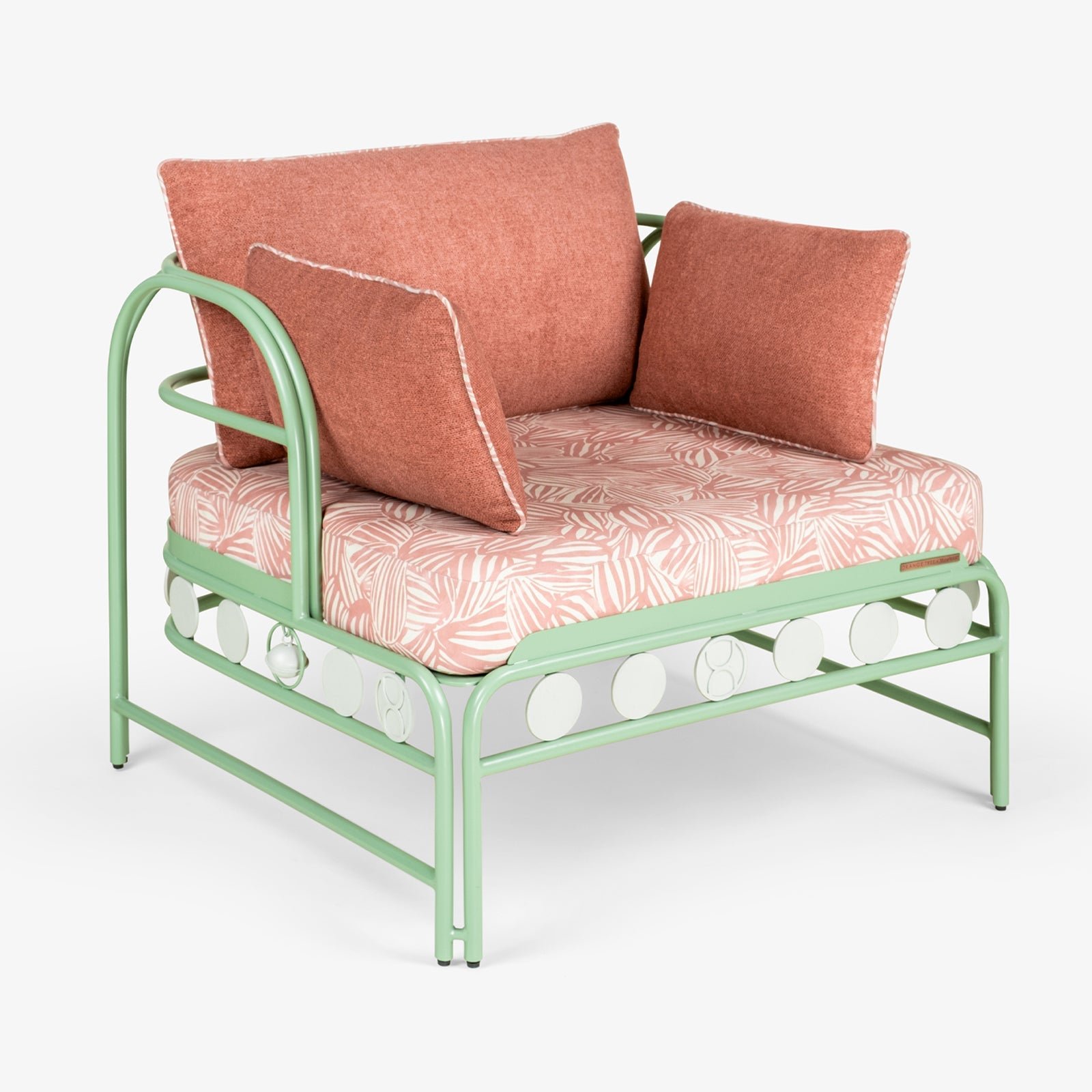 The Dastoori Single-Seater is a stylish companion to its three-seater counterpart. Crafted from double stainless steel frame, it features charming medallion accents and handcrafted bells. With plush cushions and durable outdoor fabrics, it offers cozy comfort for any relaxing spot.