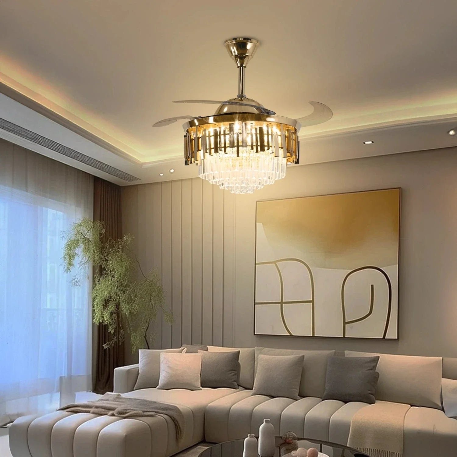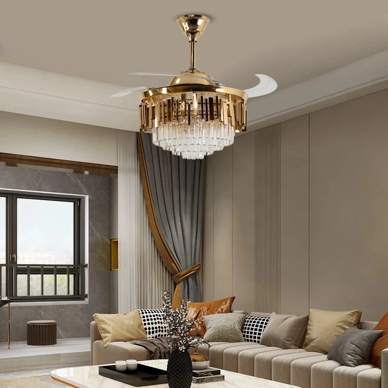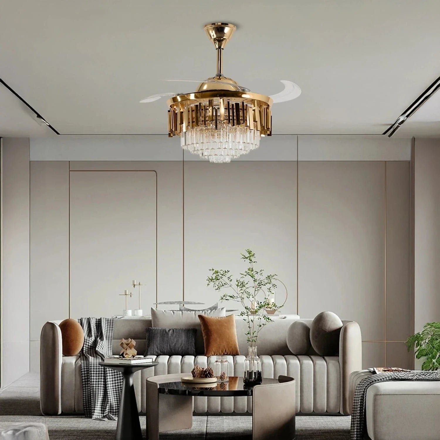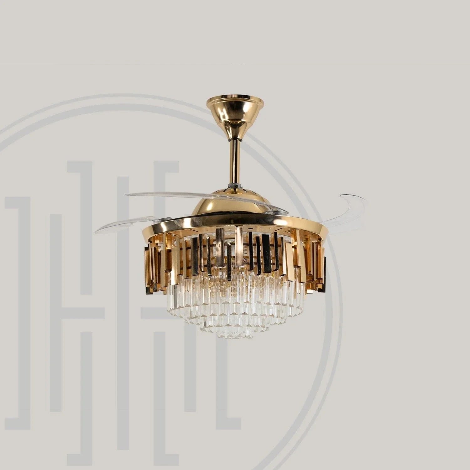 - This product is a 42-inch golden crystal ceiling fan lamp, which is equipped with a remote control, automatic retractable fan blades, and this dimmable LED light.