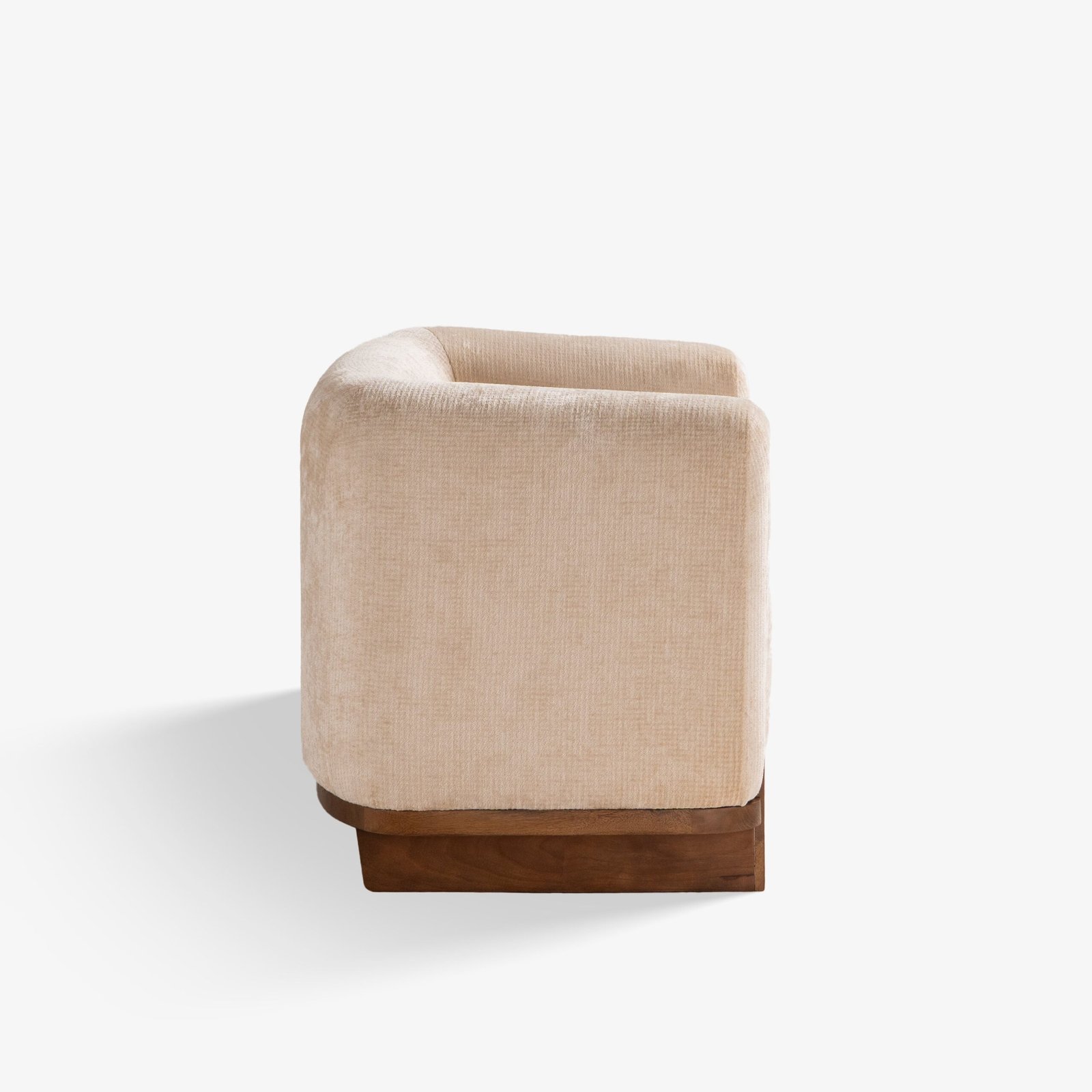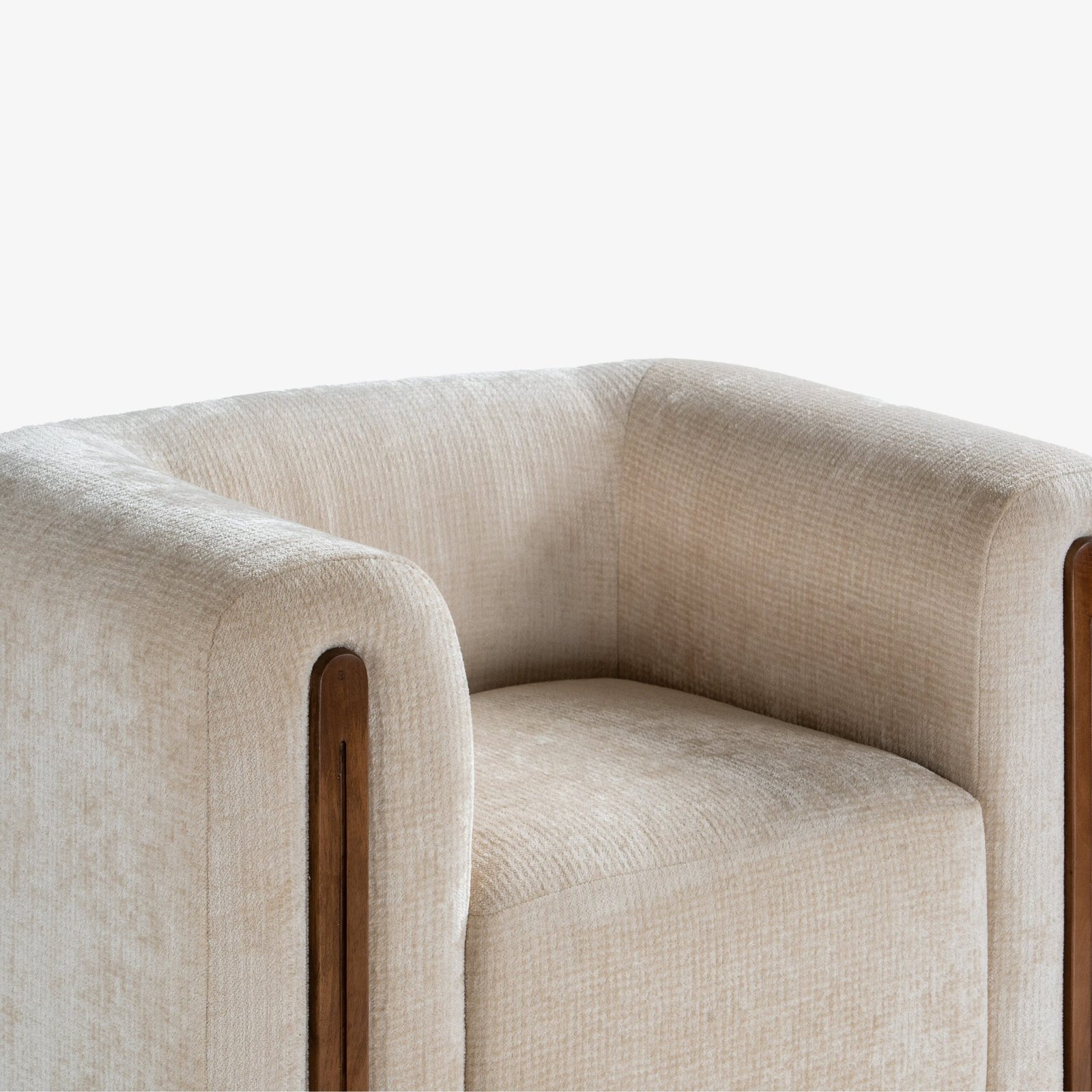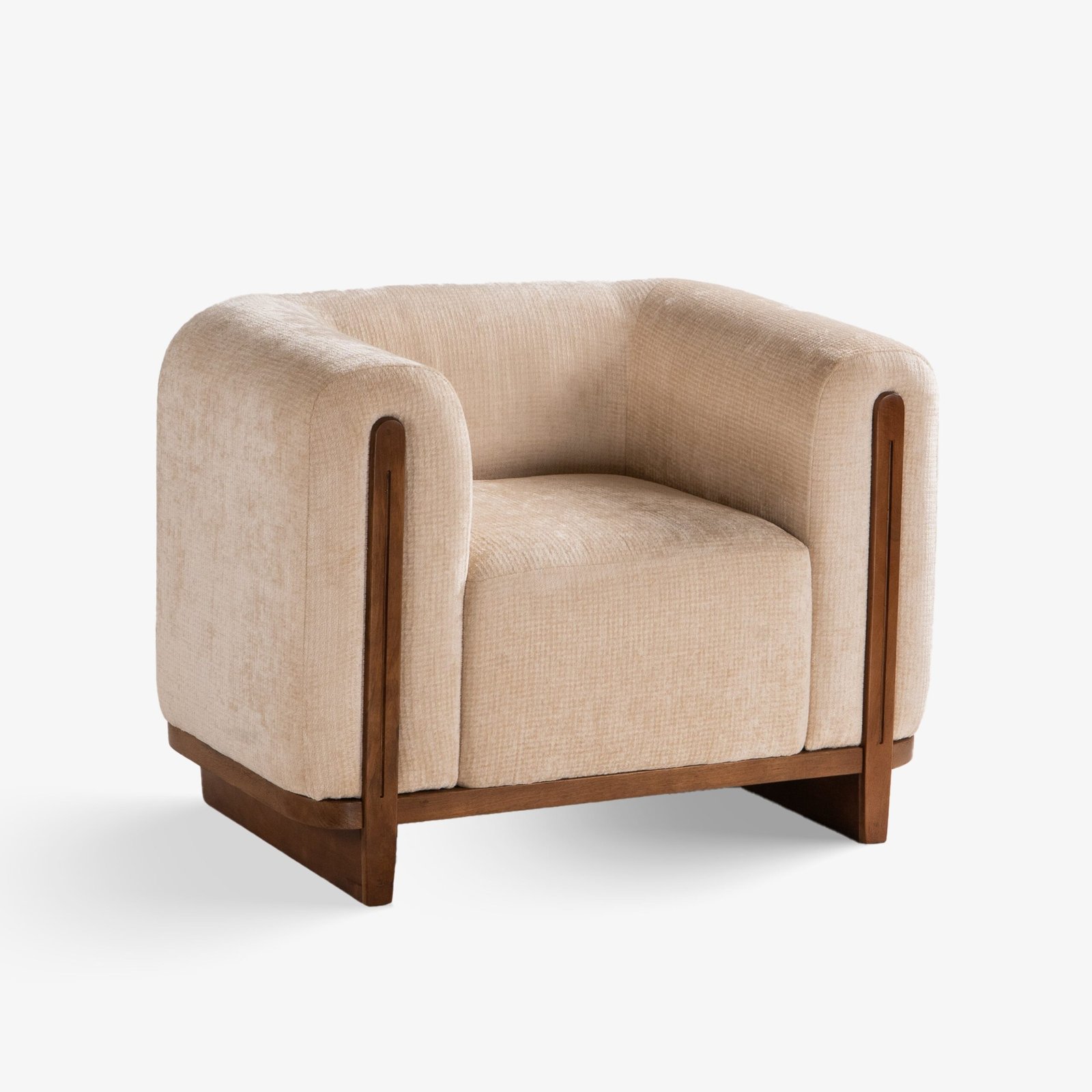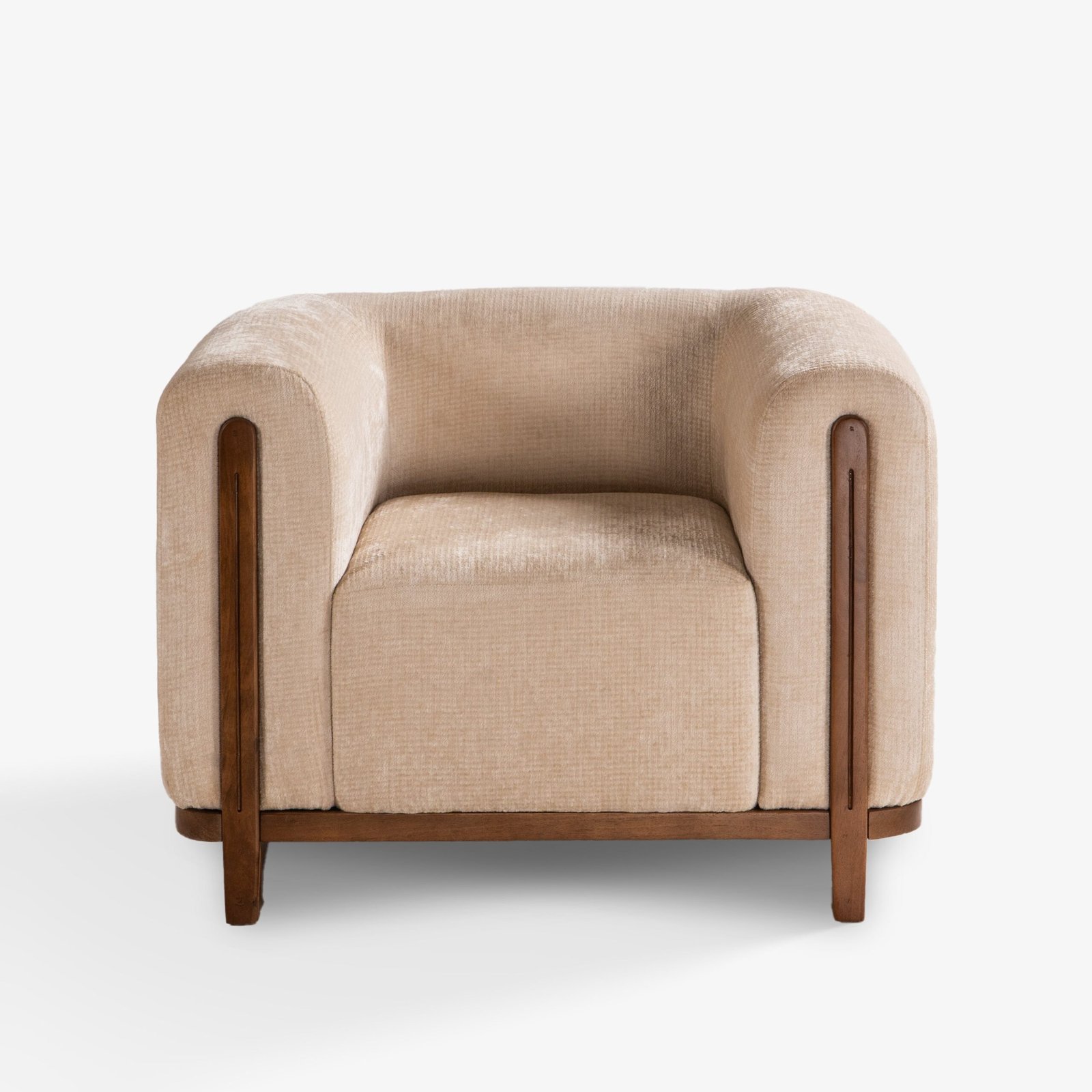 The Koro Lounge Chair is a sculptural blend of comfort and character. Its rounded arms and enveloping backrest embrace the sitter, creating a cocoon-like seating experience. Designed for modern living rooms, this piece balances plush upholstery with a bold, geometric form.