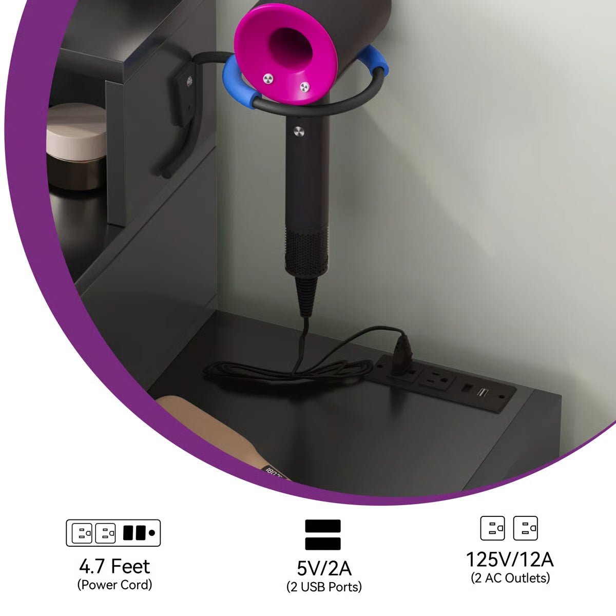 • Built-In Charging Station: Equipped with 2 standard outlets and 2 USB ports, perfect for powering hair dryers, curling irons, and other devices while you get ready.