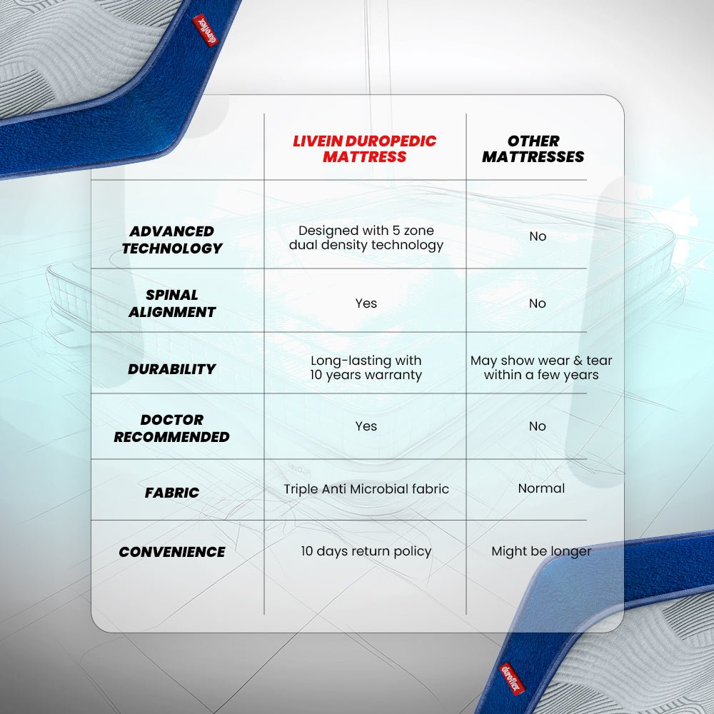 As India’s number one orthopedic bed-in-a-box, LiveIn Duropedic is an advanced back support mattress that promises you a healthy and restful sleep. This ortho mattress is designed to encourage spinal alignment and postural correction through innovative engineering and thoughtful construction. This Duroflex roll packed mattress features our certified 5-zoned orthopedic layer to lend enhanced support to your back, neck and spine. This mattress comes with our special Triple Anti Microbial Fabric to keep you protected and your bed space safe and hygienic. The signature Art Deco pattern of the luxury knitted fabric enveloping this mattress will elevate the style quotient of your bedroom.