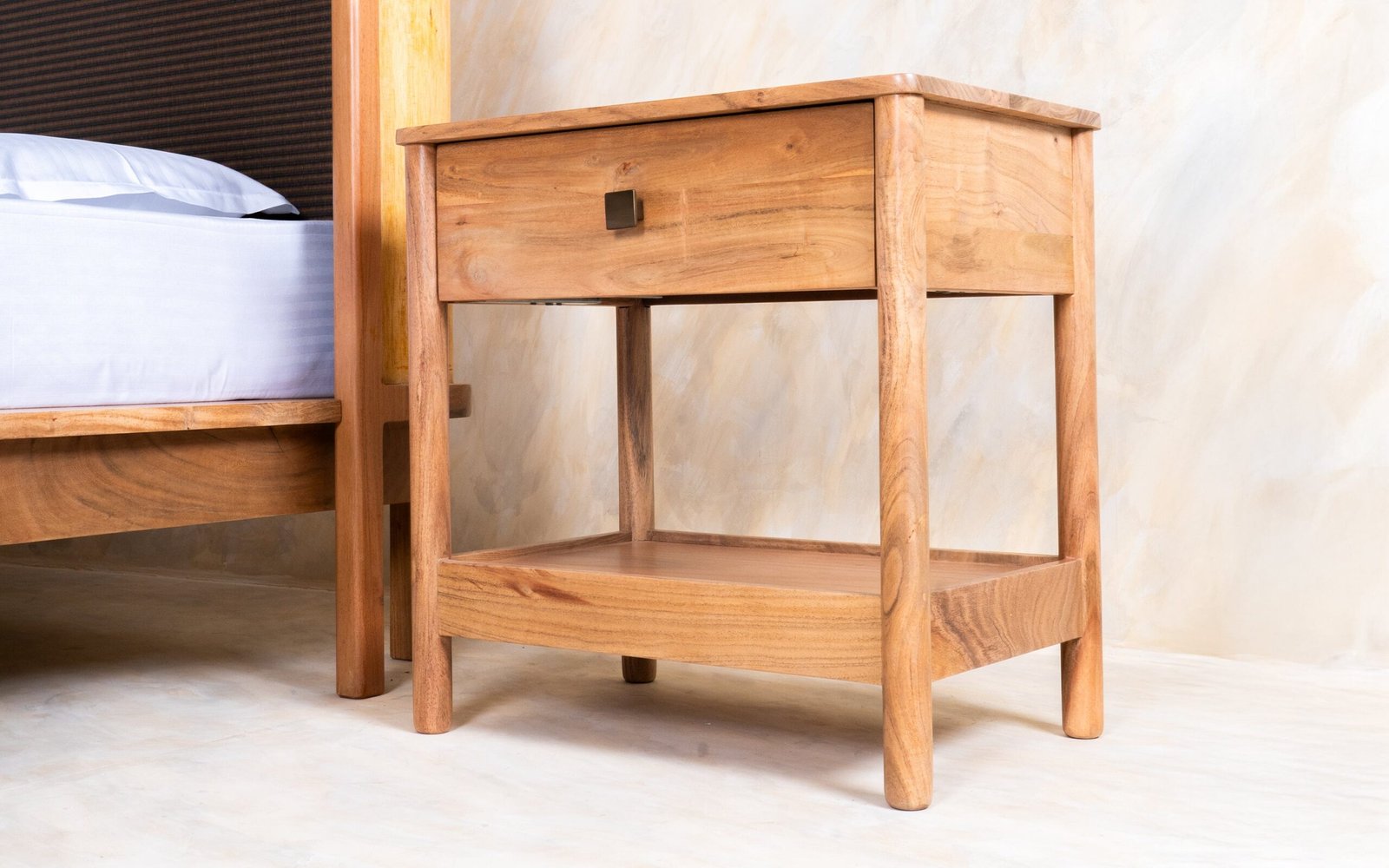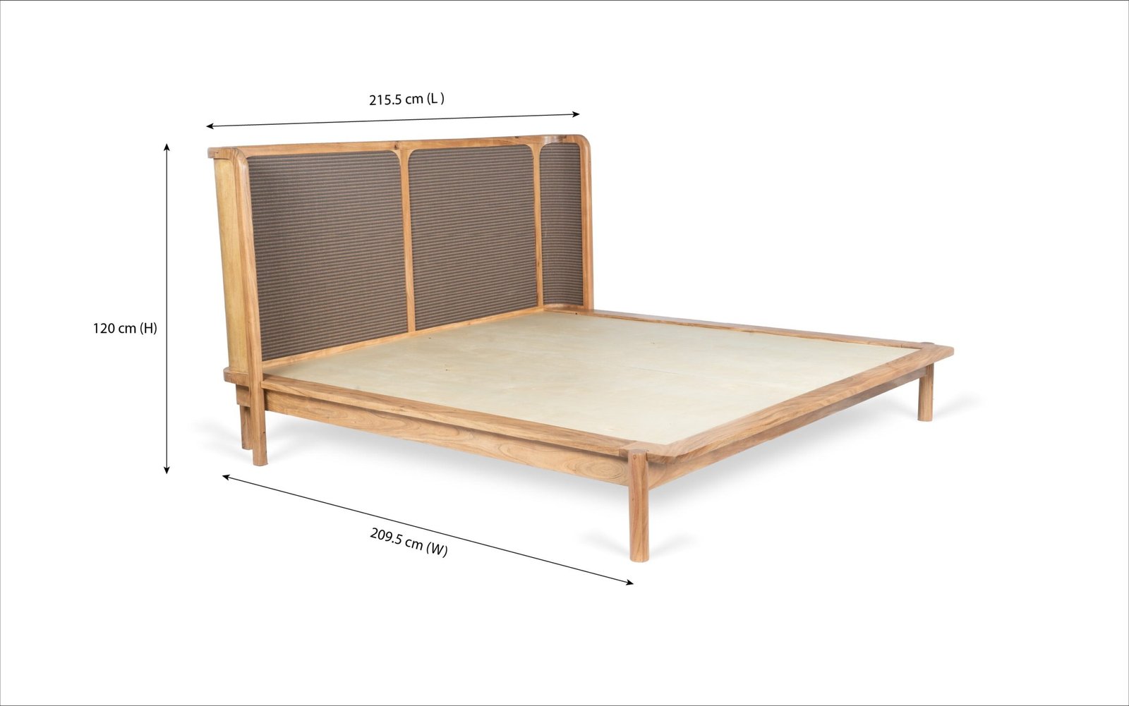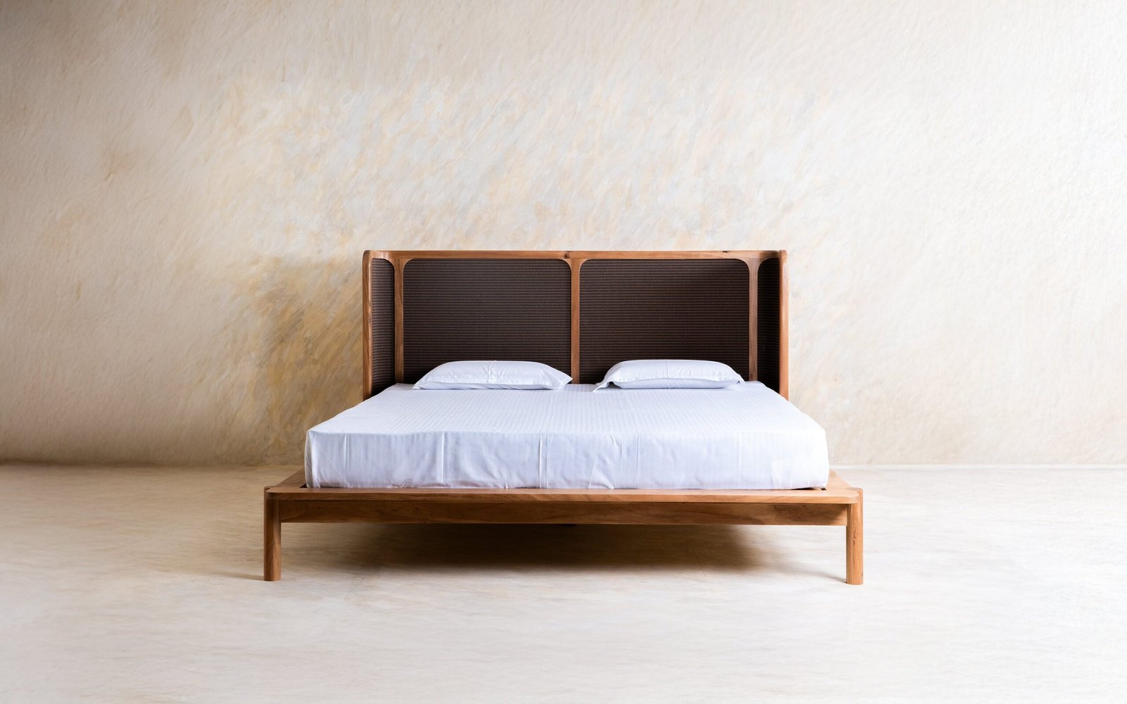 The Neo Kyoto Non-Storage Queen Bed is a stunning wooden bed that features a low platform frame made of solid wood, creating a sleek foundation that embodies a mid-century modern aesthetic and timeless craftsmanship. The high panel headboard includes a woven Japanese natural tatami mat, which adds cultural richness with its organic curves and the beauty of the natural wood grain. Overall, this bed presents a sophisticated and inviting design that beautifully blends traditional materials with contemporary aesthetics.
