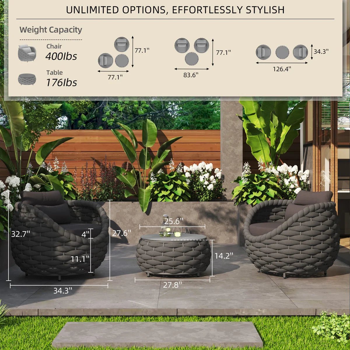 Outlee Outdoor Patio Seating Set 2 Chairs and 1 Table Set (Dark Grey) Braided & Rope