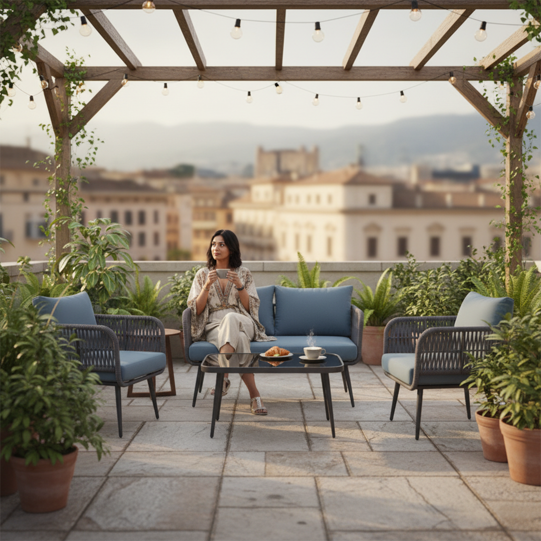 Relax in comfort and style with our Iconic sofa set. This Elegant sofa set is manufactured with style and comfort in mind. When searching for convenient outdoor furniture for any space, this sofa set won’t let you down. This garden set will fit on most balconies, giving a beautiful look.