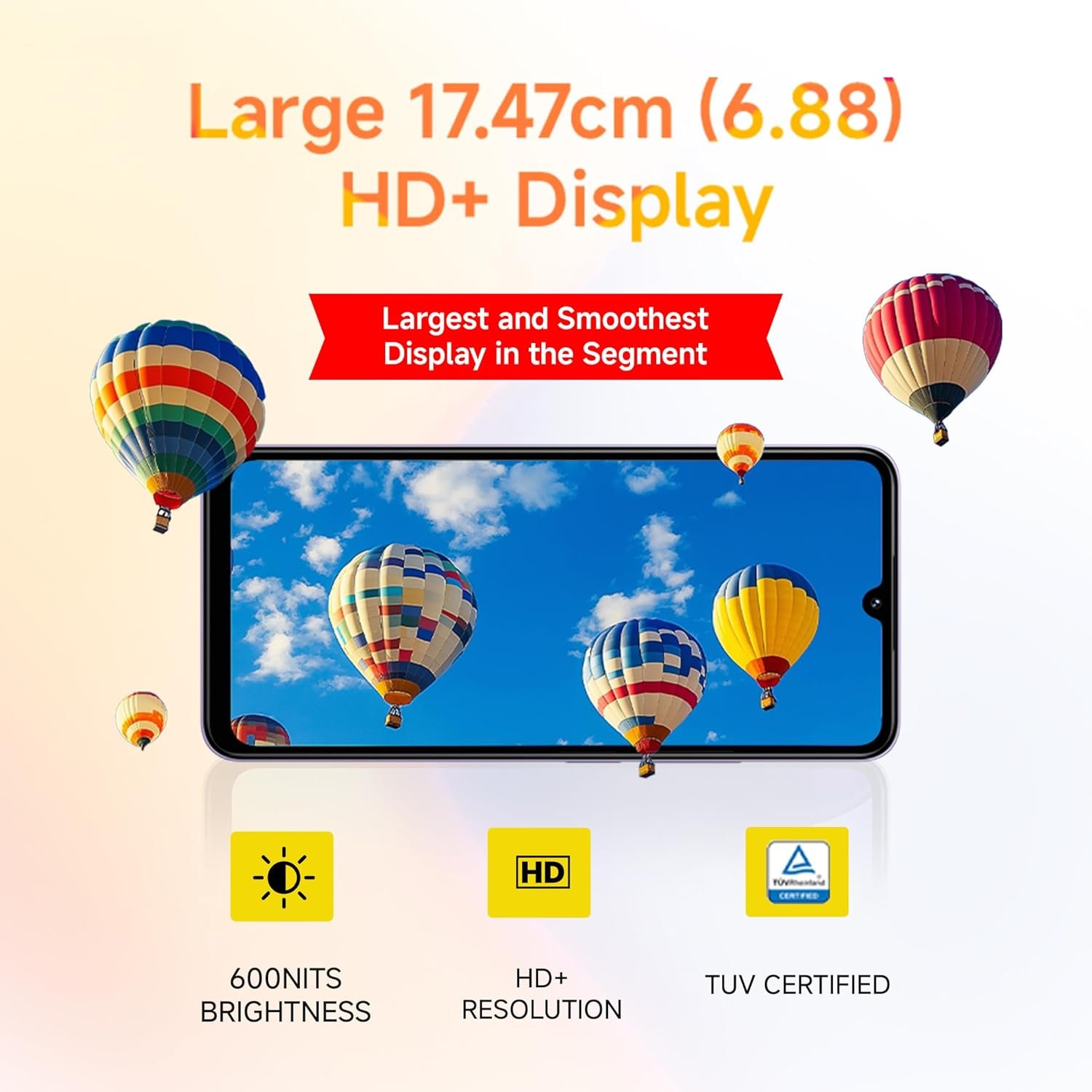 • Display: Large 17.47 cm 120Hz Refresh Rate display | 600nits peak brightness | 240Hz Touch sampling Rate | TUV triple certified eye care protection
