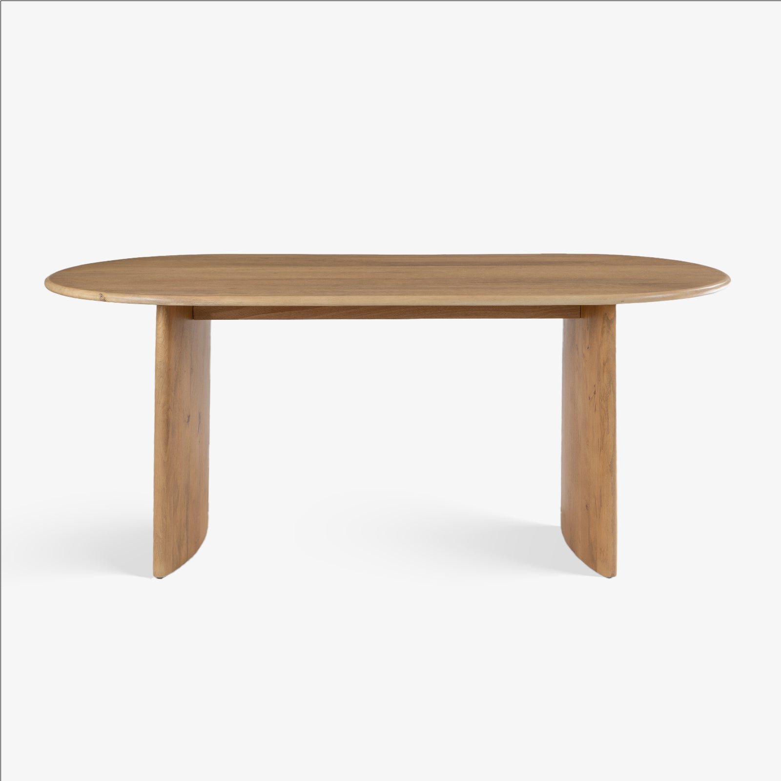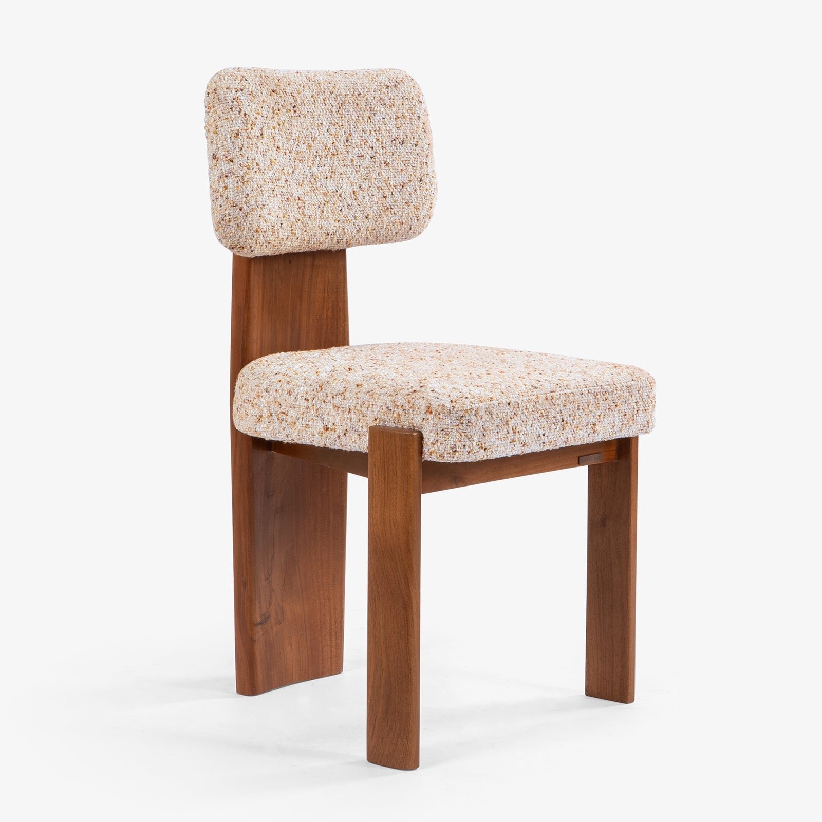 The Saanra Dining Set offers a blend of organic shape and architectural simplicity for the modern home. The Gahana Dining Table features a unique, organically-shaped Acacia wood top set upon two bold, curving pedestal bases accented with subtle brass detailing. This striking table is paired with the Akar Dining Chair, which emphasizes geometric comfort through its deep-cushioned, upholstered seat and backrest, supported by a distinct, clean-lined Acacia wood frame, all finished in a rich Kiara hue.