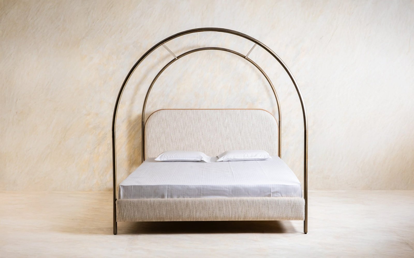 The Solace Canopy Bed features a fresh, eye-catching, and contemporary design. It boasts a sleek frame that arches gracefully, complemented by an upholstered headboard and footboard that enhance the elegant curves of the canopy. The light and airy-like bed artfully creates a combining of modern aesthetics with everlasting grace.