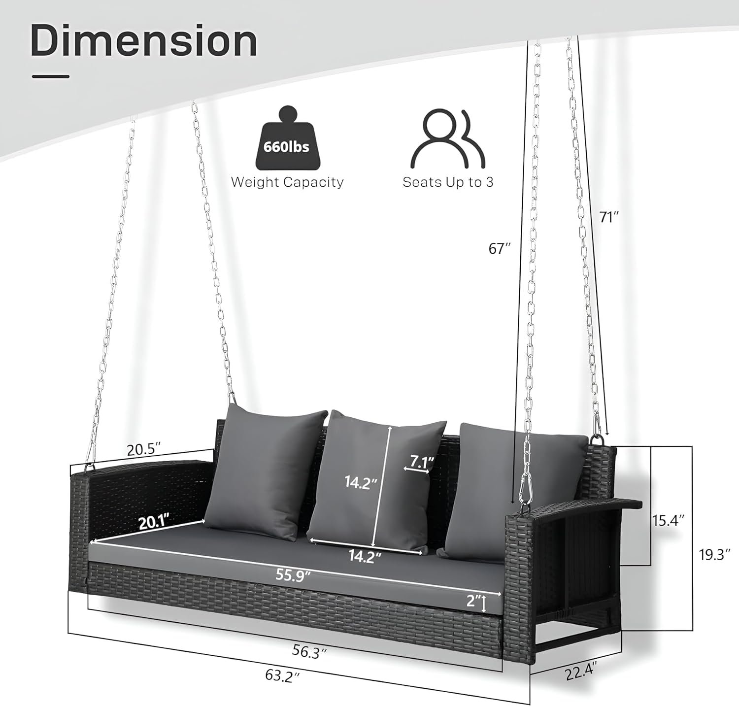 Vito Three Seater Hanging Swing Without Stand For Balcony , Garden Swing (Black)